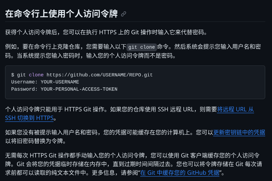 注意上述方式只支持 https 的登陆,ssh 不能使用 PAT 进行登陆,而 Github 也给出了这个 PAT 具体是怎么使用的