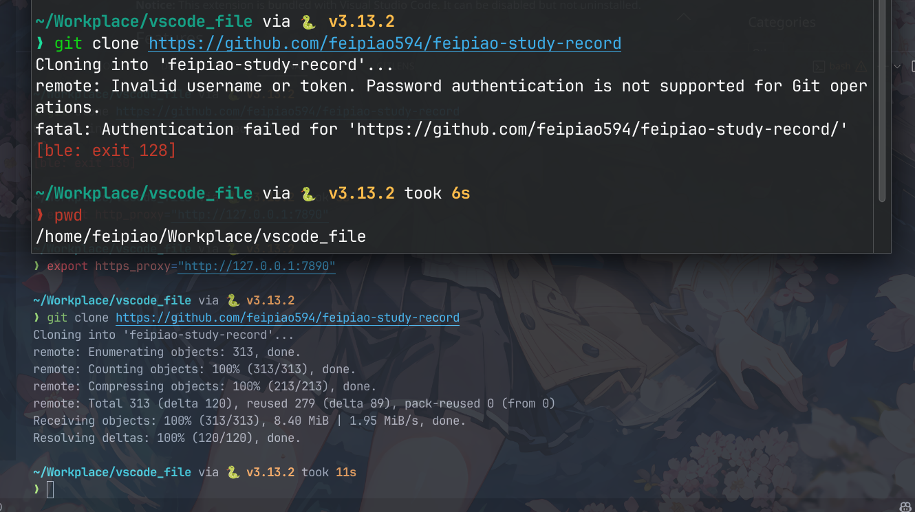 于是在实践下我发现了一些东西,feipiao-study-record 是我新建的一个私有库,在 vscode 的聚合终端和外部的 konsole 中完全不一样