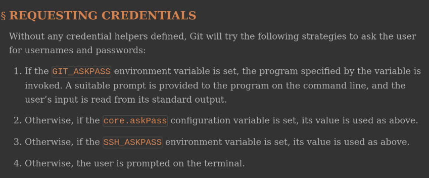 - 官方 git cli 可以从别的地方读入 username + password,有 credential.helper 和 askpass 系环境变量两种,其中前者优先级更高,详情请看上方标注出的官方文档