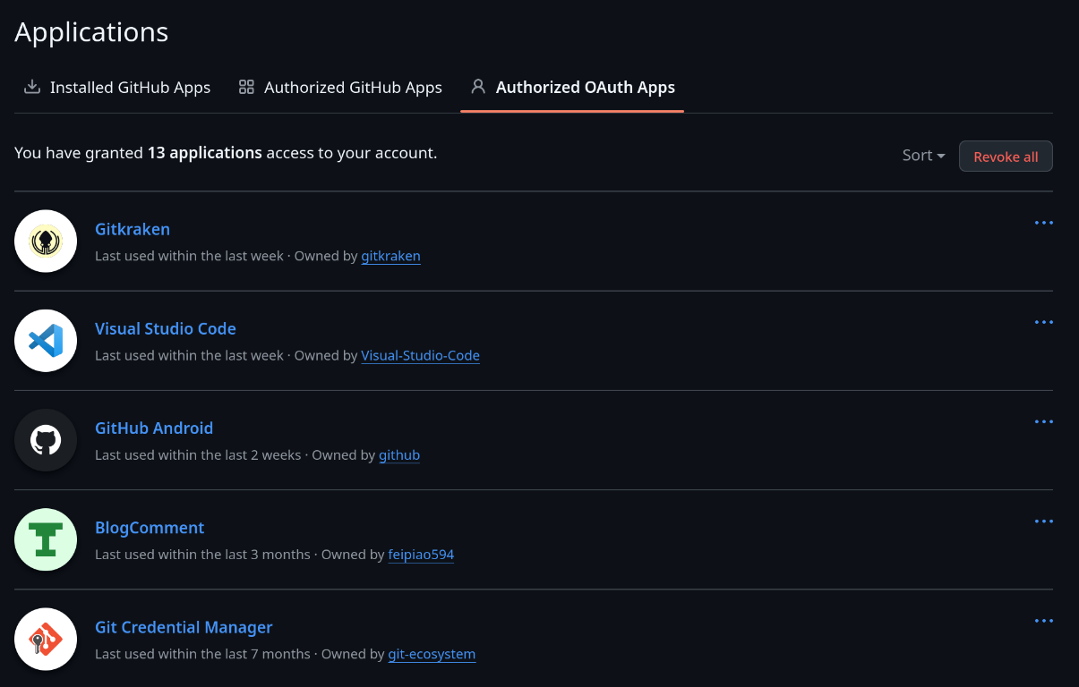 可以看到啊,在 github 的 settings - application 里有相关的允许的认证客户端的信息,vscode 插件的认证次数要远多于 gcm (我这边按照 Recently Used 排序了)